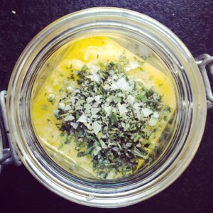 Vi gör olika varianter lite på känn men en favorit är denna med dragon, timjan och rosmarin blandat i Ghee.