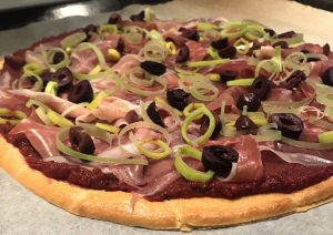 Sen är det bara att ösa på med det du gillar mest! Prosciutto, oliver, lök, banan, skinka, skaldjur. Har du fantasitorka så googla närmsta pizzeriameny och låt dig inspireras. Sen är det bara att göra sin egna, lite hälsosammare, variant!