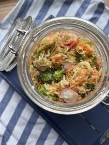 En treveckorssallad är ju en riktigt smart idé. Man jobbar lite initialt och sen njuter man av färdigfixad sallad i ett par veckor. Dessutom är salladen rik på fibrer, vitaminer, mineraler, bra fetter och äppelcidervinäger som kan stimulera den egna produktionen av saltsyra i magsäcken. Att stötta sin matsmältning med någon/några tsk med äppelcidervinäger i ett glas vatten innan maten är ett bra knep som jag ofta använder mig av, både till mig själv och mina klienter.