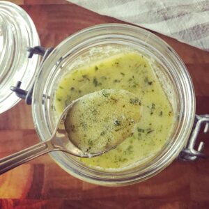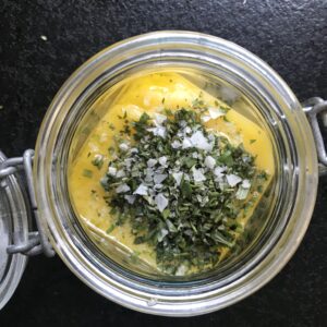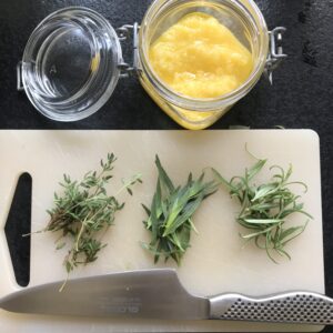 Vi gör olika varianter lite på känn men en favorit är denna med dragon, timjan och rosmarin blandat i Ghee.