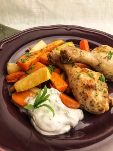 Under tiden allt-i-ett-plåten var i ugnen rörde vi ihop en dragonsås med kokosyoghurtbas, den blev fantastiskt god! Om du inte gjort kokosyoghurt själv förut så rekommenderar vi verkligen det. Här kan du läsa mer om hur man gör kokosyoghurt.