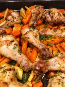 Dagen efter plockade vi upp rotfrukter som redan fanns i frysen (sååå bra räddare i nöden!) lade på en plåt, på med olja, salt och peppar och kyckling.