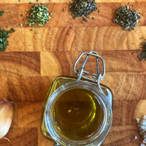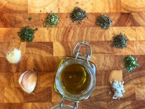 Förr i tiden använde jag alltid kryddblandningen ”Salladskrydda” när jag skulle slänga ihop en enkel vinägrett, snabbt och gott. Men sen började jag följa AIP och med det följde ett väldigt lusläsande av innehållsförteckningar. Då konstaterade jag att Salladskryddan innehåller både socker och klumpförebyggande medel… Något man alltså vill undvika under AIP specifikt men egentligen alltid generellt! Bättre då att ha många olika kryddor i sitt kryddskåp och blanda efter tycke och smak.