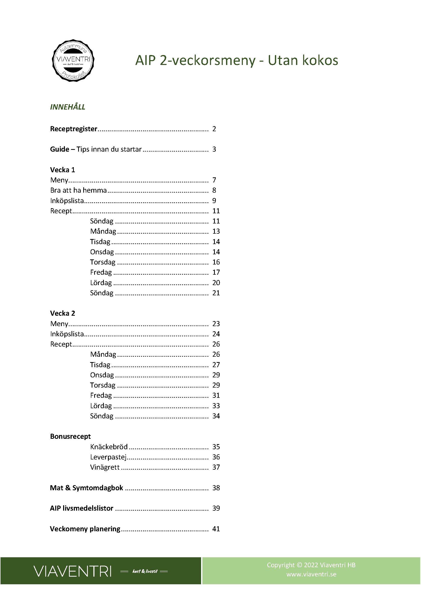 Skip to contentI den här receptboken får du tillgång till meny, recept och inköpslistor för att hjälpa dig att planera och följa en strikt AIP kost helt utan kokosprodukter i två veckor.