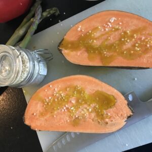 Grädda mitt i ugnen ca 20-25 minuter. Känn efter med sticka så potatisen är mjuk.
