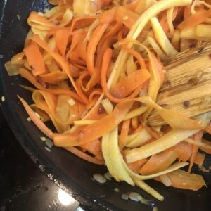 Skala alla ingredienser. Använd en mandolin eller potatisskalare för att göra "remsor" av morötterna och palsternackan. använder du mandolin kanske du vill dela remsorna på längden så de blir lite smalare.